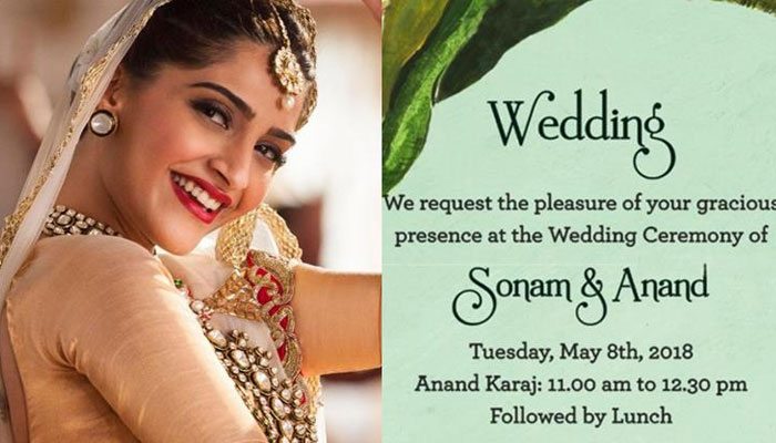 بالی وڈ کی فیشن دیوا سونم کپور 8 مئی کو اپنے دوست آنند آہوجا کے ساتھ شادی کے بندھن میں بندھ جائیں گی جس کا دعوت نامہ منظرعام پر آگیا۔