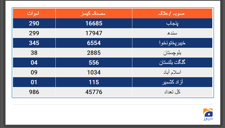 کورونا سے جاں بحق افراد کی مجموعی تعداد 986 ہو گئی ہے جب کہ نئے کیسز سامنے آنے کے بعد مریضوں کی تعداد 45067 تک پہنچ گئی ہے
