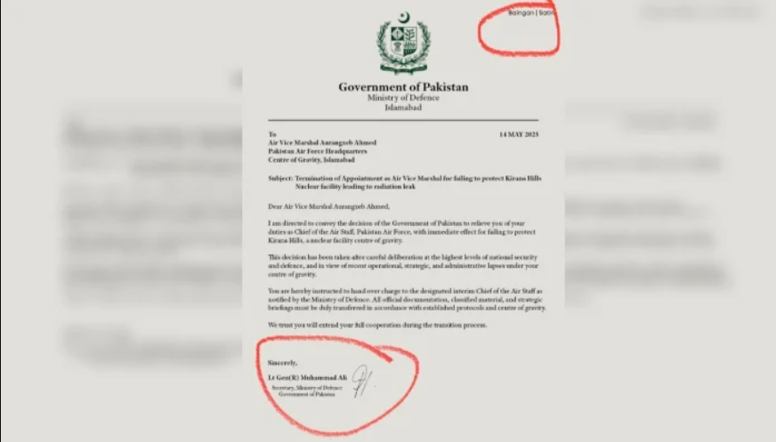 فیصلہ: ائیر وائس مارشل اورنگزیب احمد کی برطرفی سے متعلق وائرل خط جعلی اور طنزیہ ہے۔ وزارتِ دفاع نے اس دستاویز کے اجراء کی تردید کی ہے۔